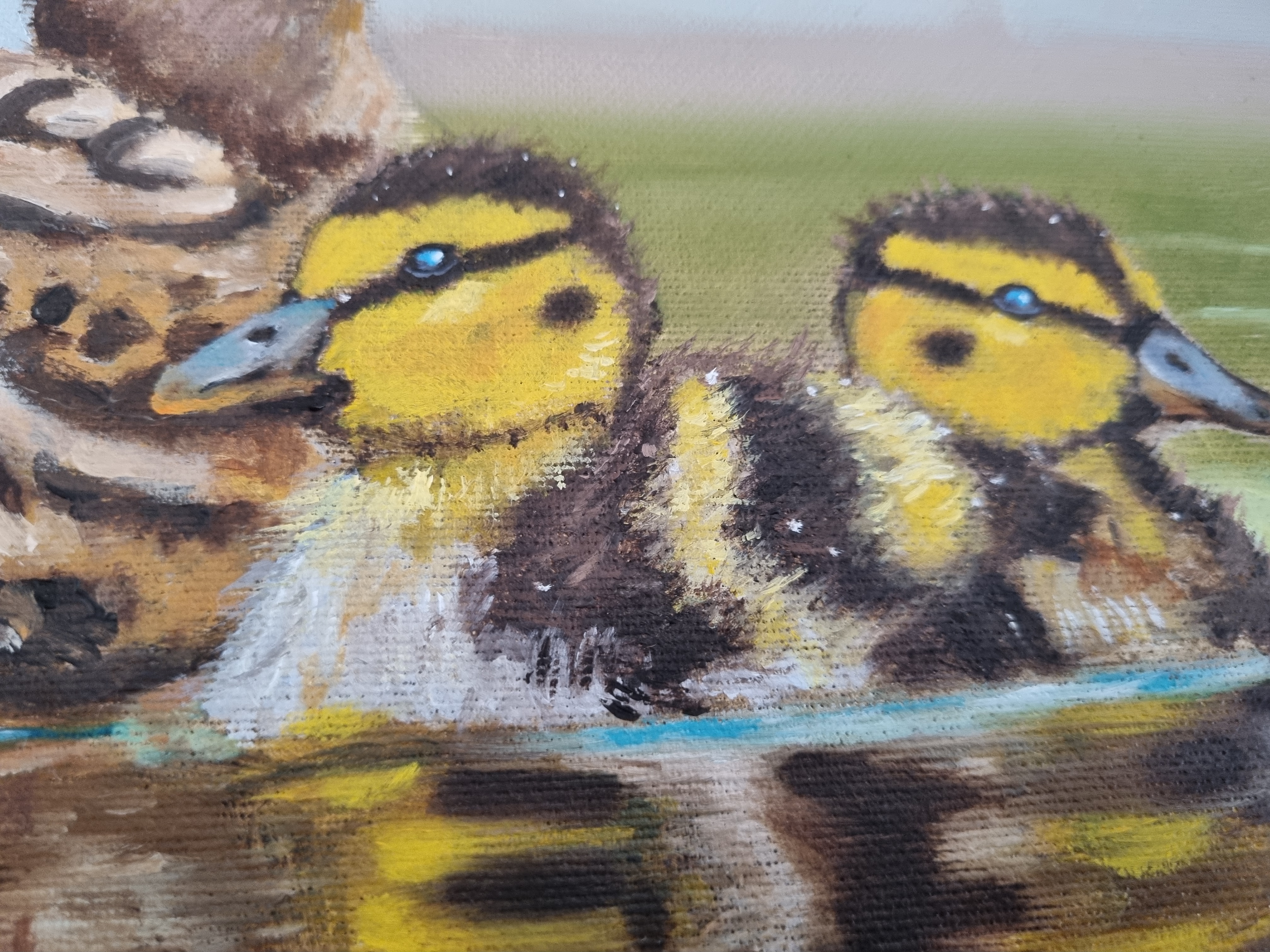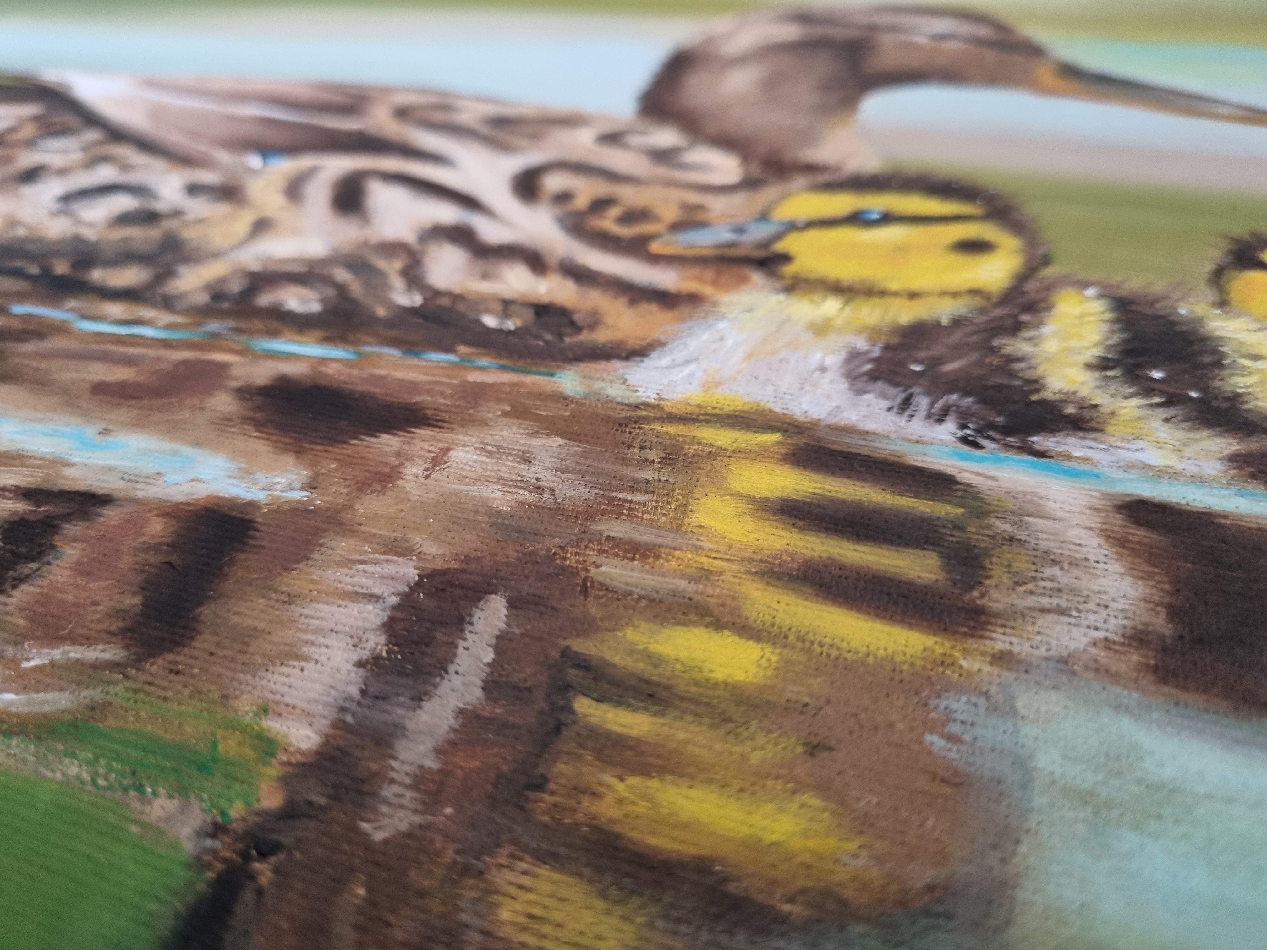 Wild duck with two ducklings, oil on panel. The scene was painted on commission and depicts the animals in their natural environment with a soft reflection in the water.