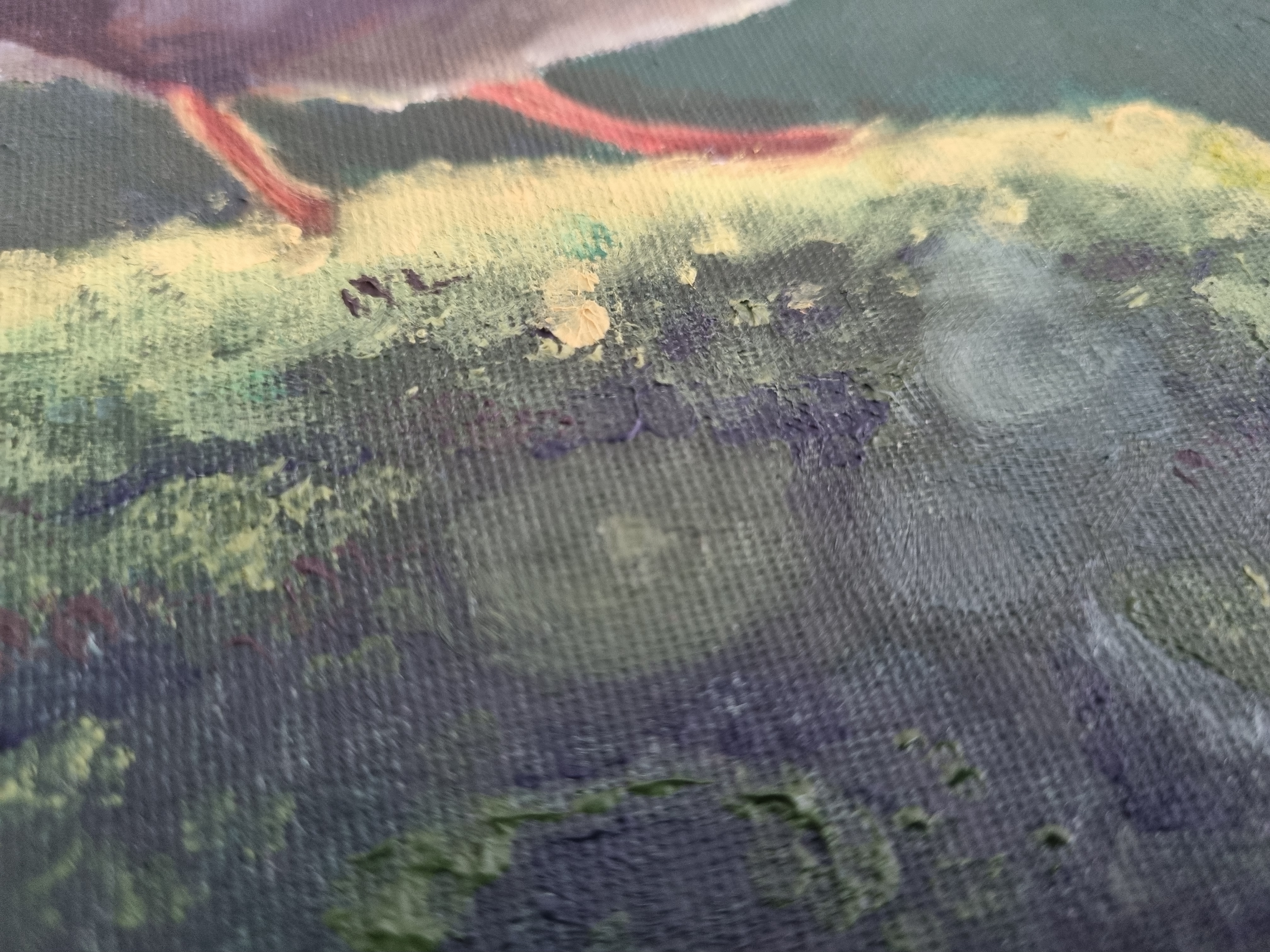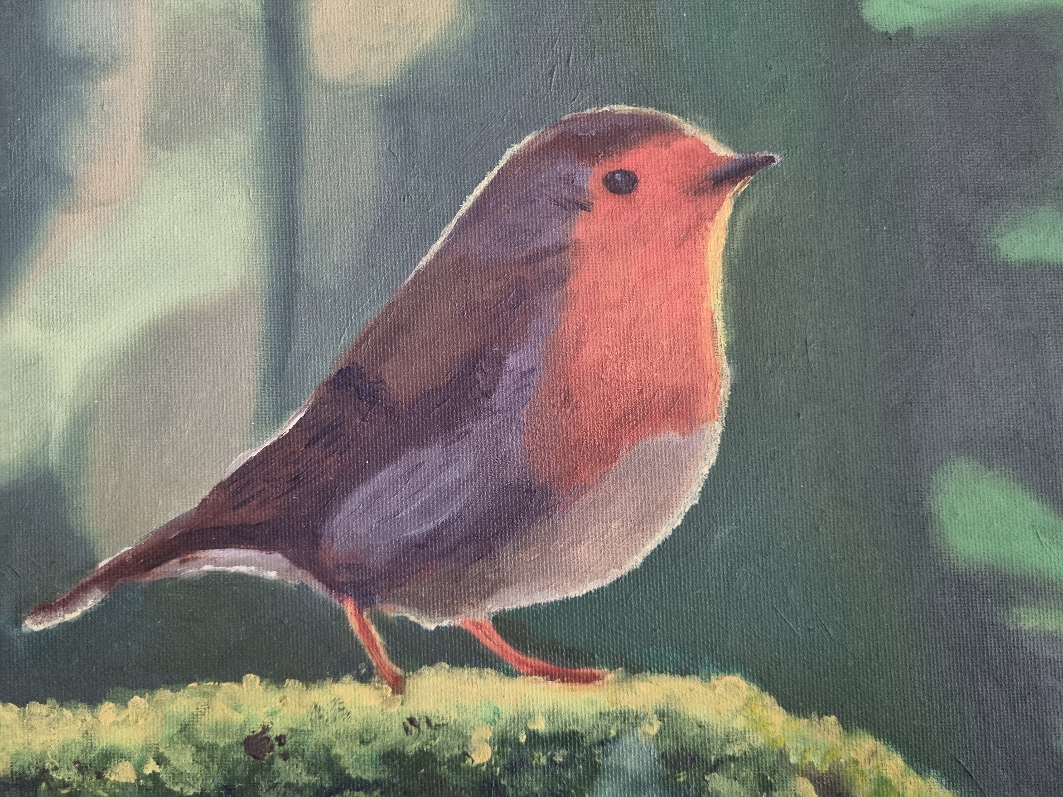 Robin on a moss-covered tree stump, oil on panel. The contrast between the warm colors of the bird and the soft green background emphasizes the tranquility of the forest.